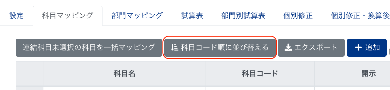 「科目コード順に並び替える」ボタンをクリックすることで、科目コード順に科目の並び替えをすることができます。