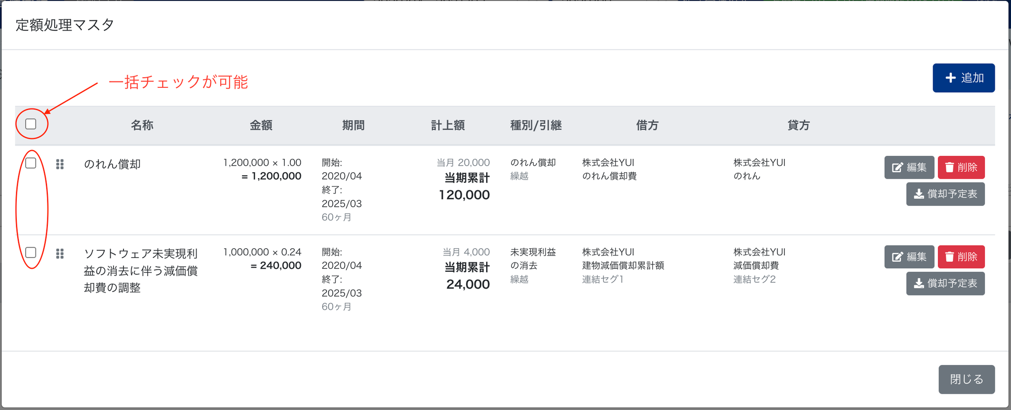 - 削除したい仕訳にチェックをすると、「削除」ボタンが出てきますのでこちらで一括削除が可能です