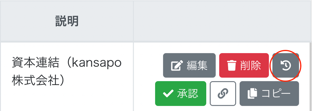 - 作成された仕訳の「履歴」ボタンをクリックします