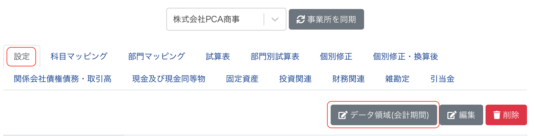 2-1 PCAクラウドを利用している場合で会計期間を追加する場合は、各社の個社連結PKGの「設定」画面の「データ領域(会計期間)」ボタンをクリックします